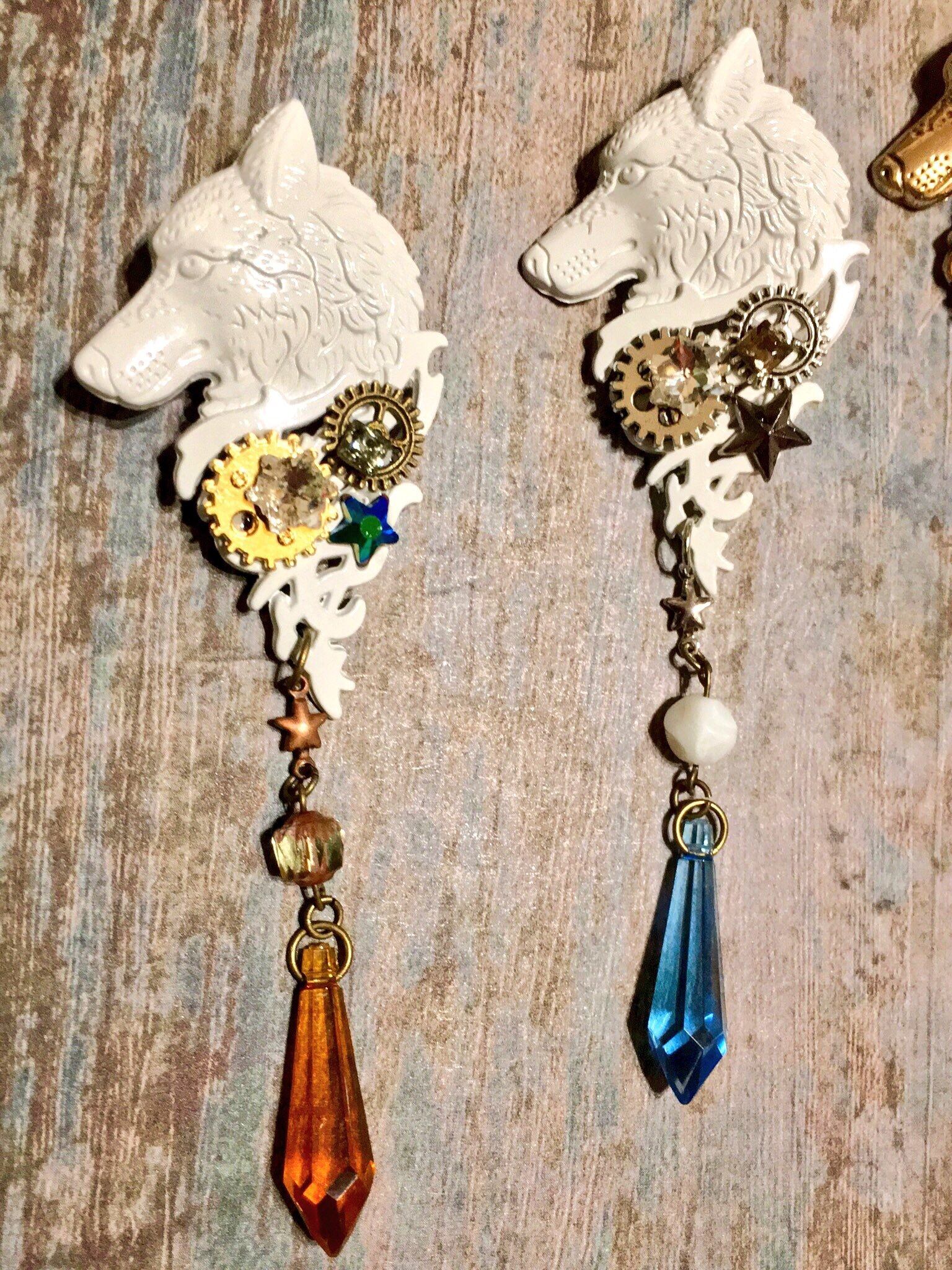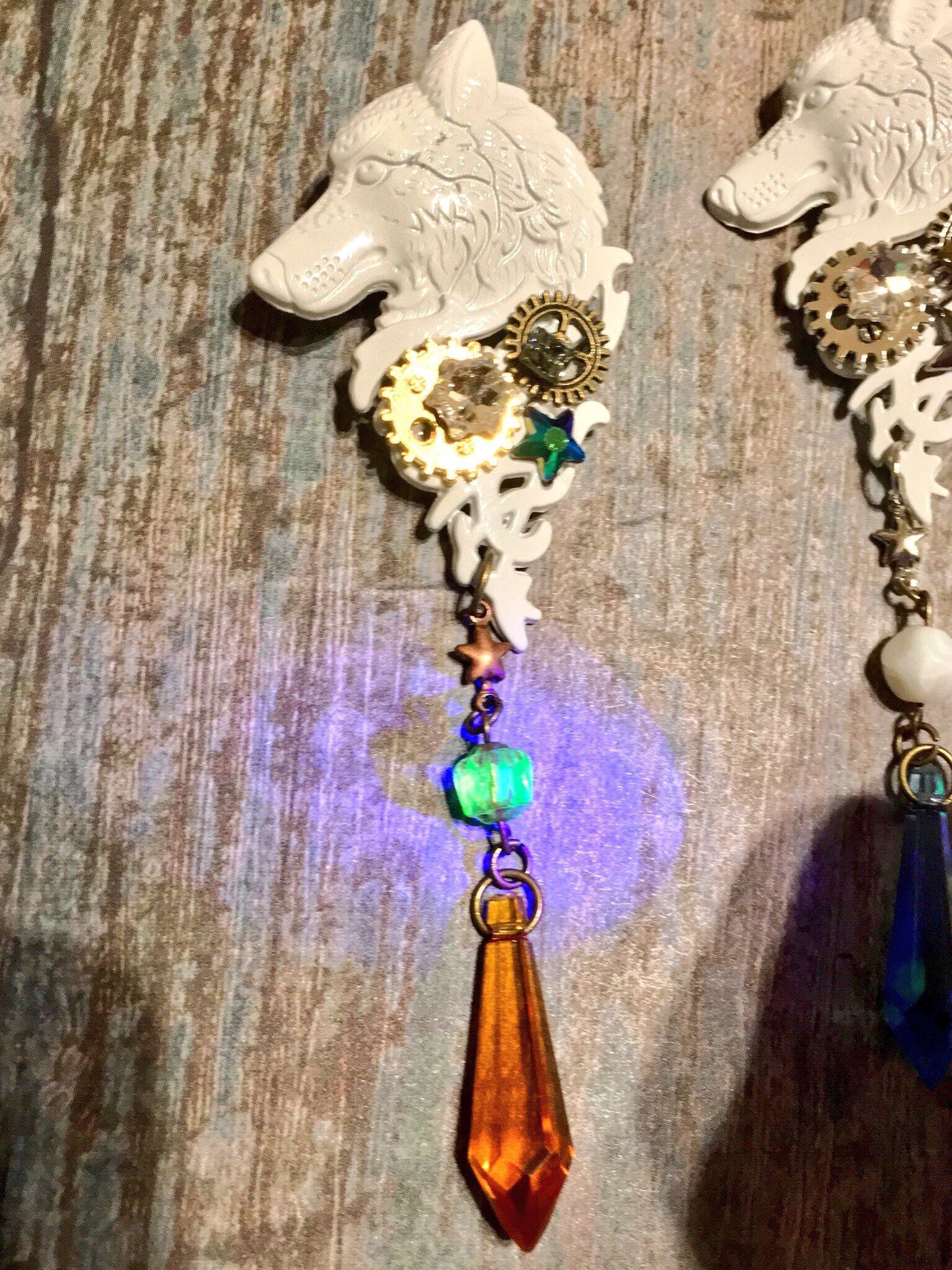 オオカミを歯車とスワロフスキーで飾り、ソード型クリスタルのチャームを合わせました。