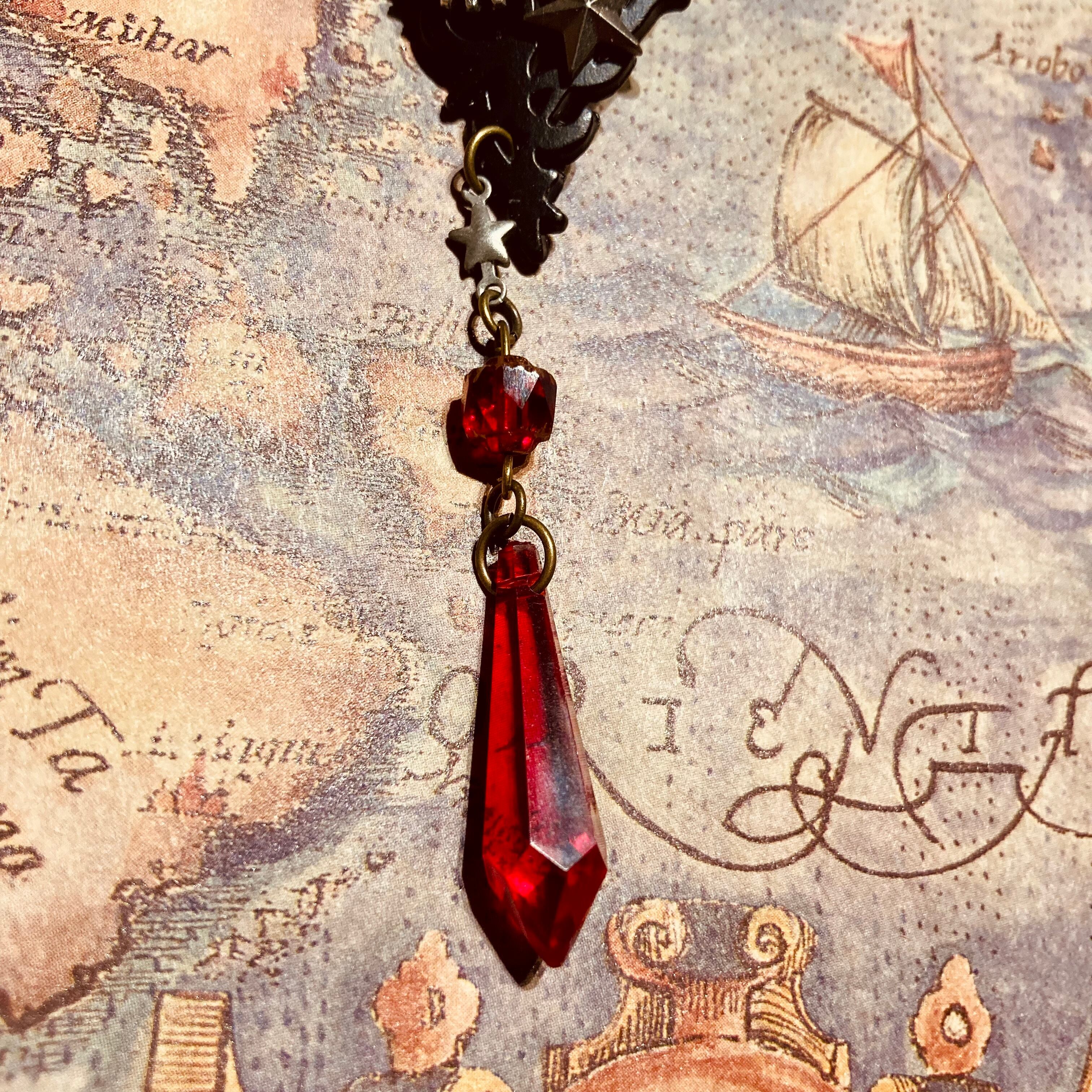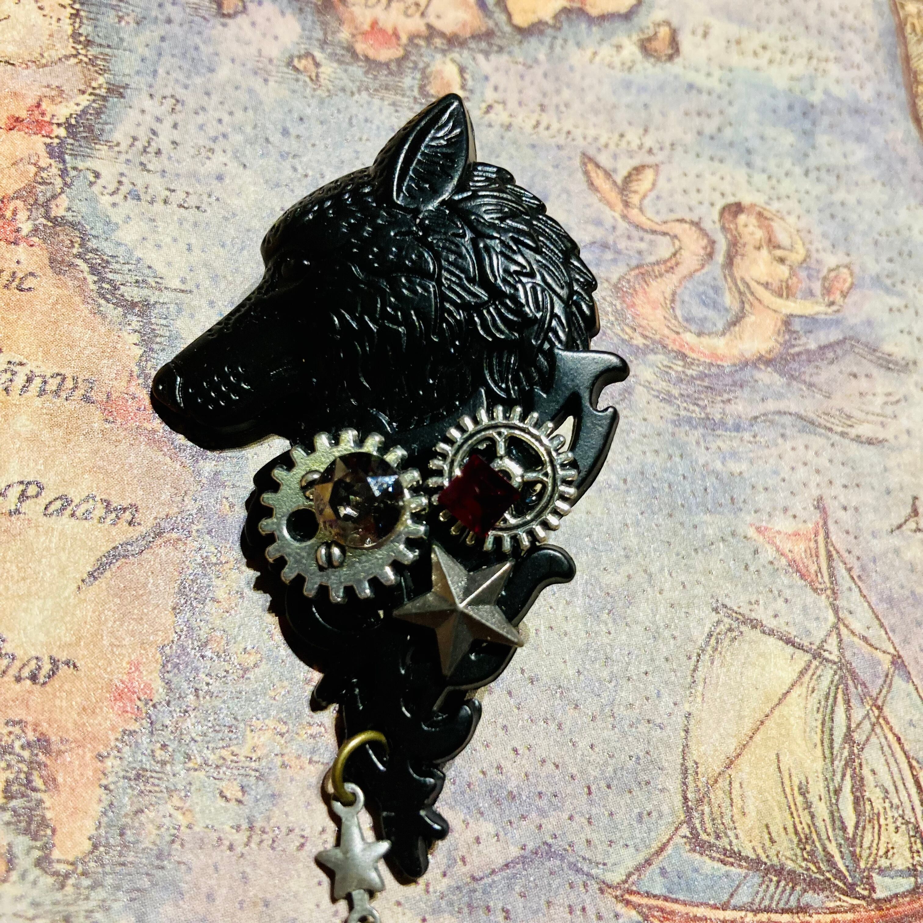 オオカミを歯車とスワロフスキーで飾り、ソード型クリスタルのチャームを合わせました。