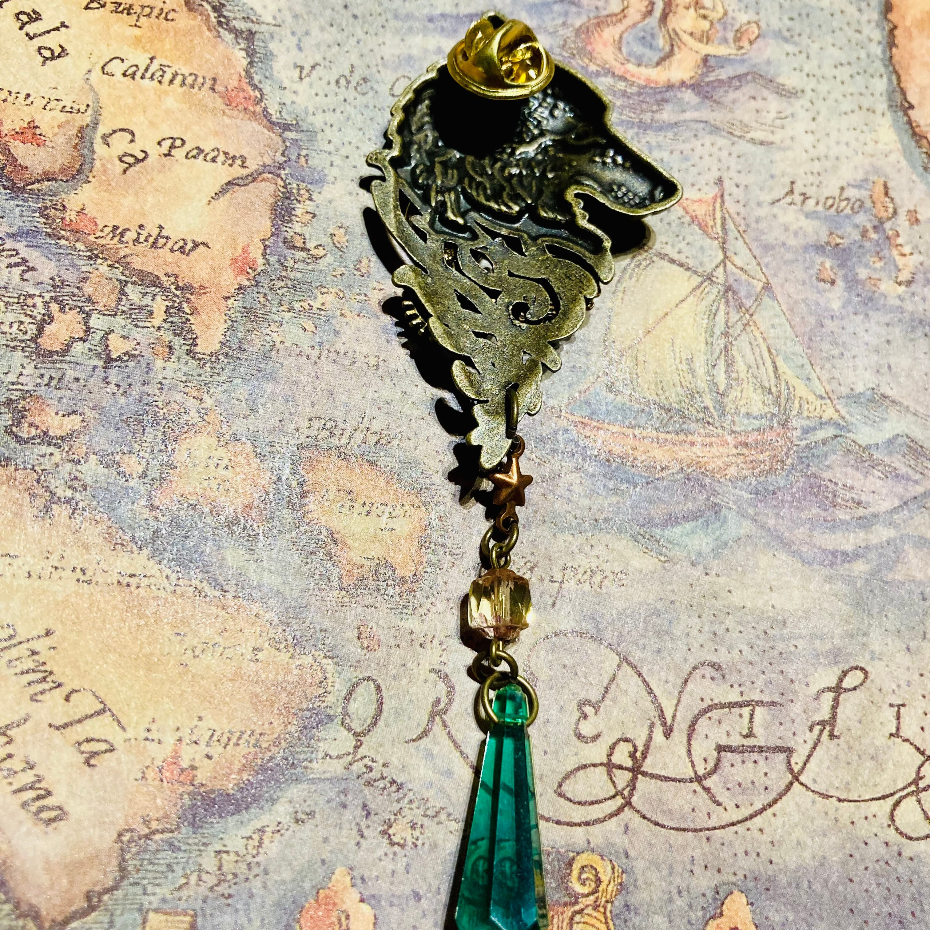 オオカミのピンバッジ(アンティークゴールド×グリーンチャーム)
