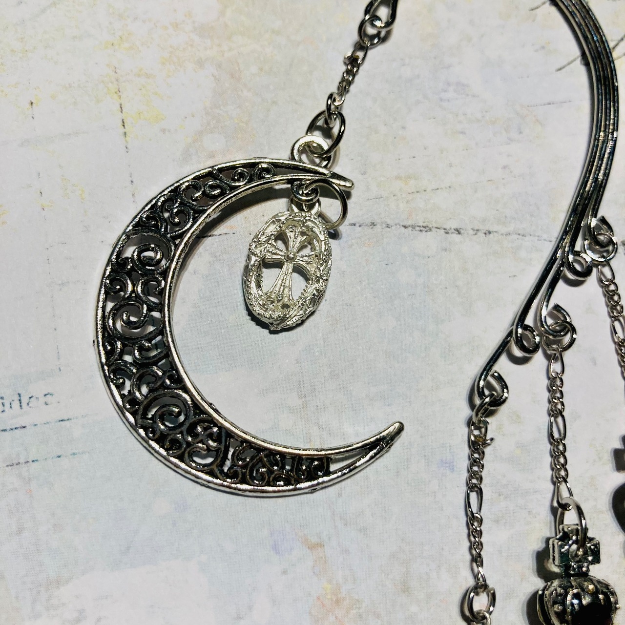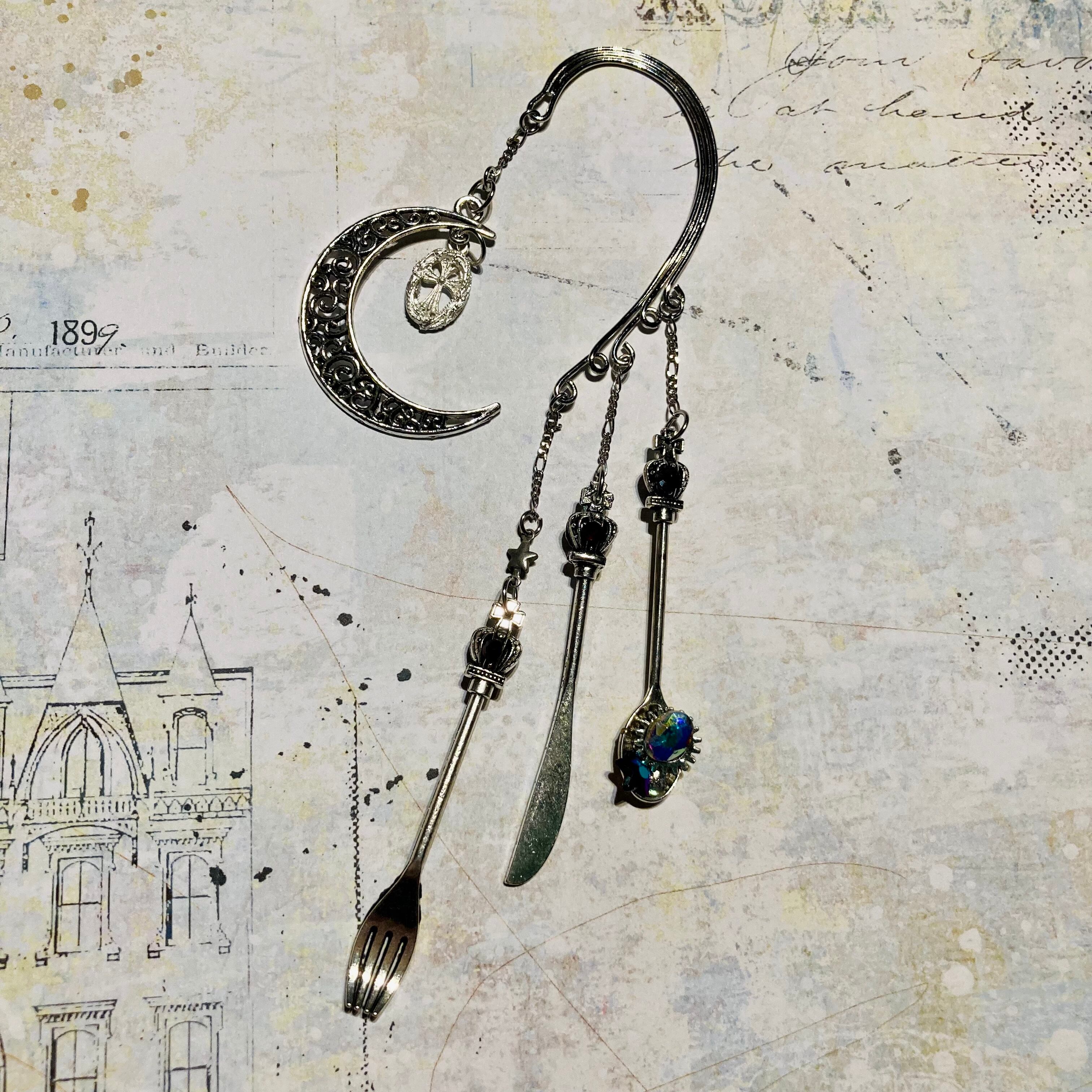 カトラリーのチャームをメインにして、クロスのチャーム、三日月を合わせてイヤーフックにしました。
