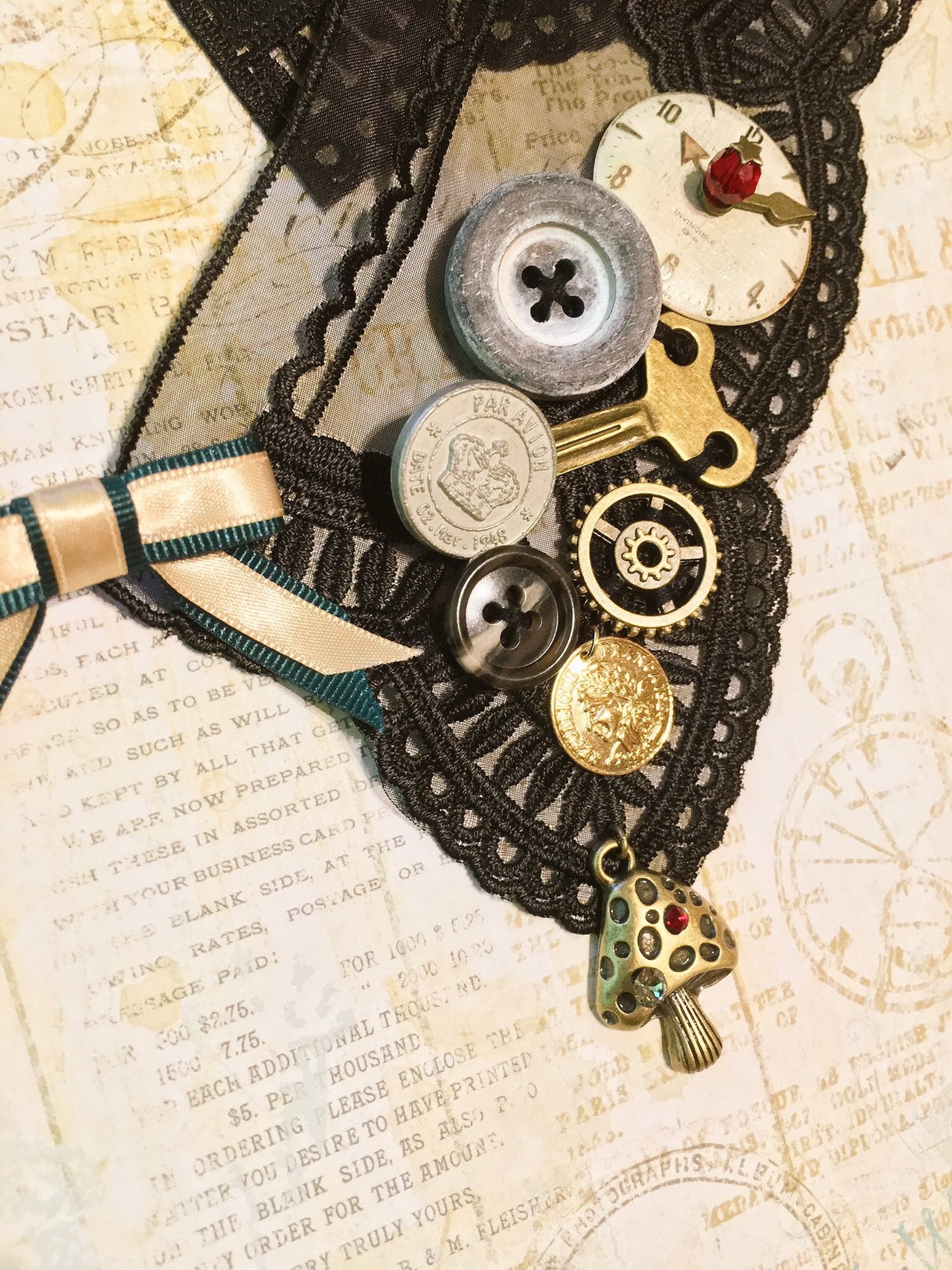 黒いレースの襟にさまざまな種類のボタンと時計盤やぜんまい、ガラスビーズやキノコのチャームを飾りました。 サイズ(襟の片方) タテ:約23cm、ヨコ:約7cm
